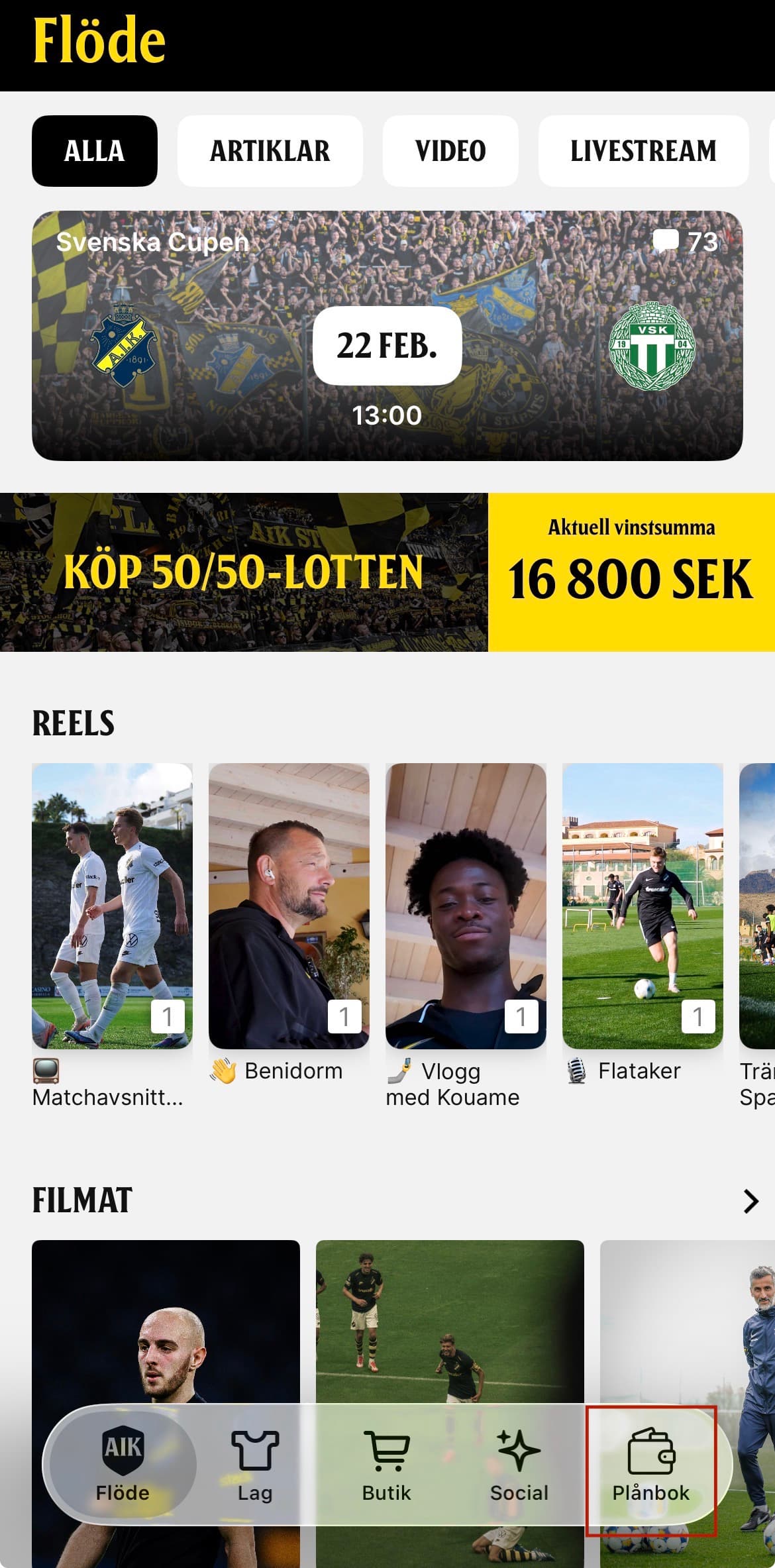 Väl inne i appen AIK+.