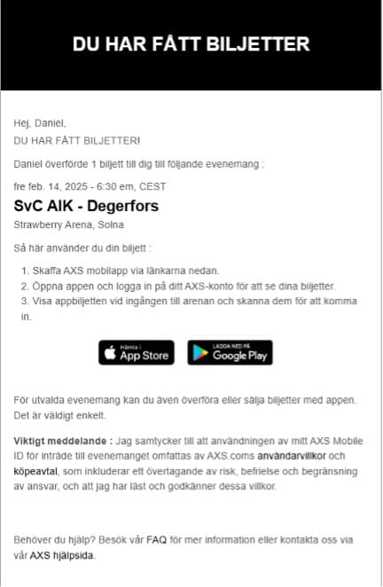 När överföringen är genomförd , behöver den som tagit emot biljetten endast se till att logga in i AIK+ eller AXS app för att se sin biljett.