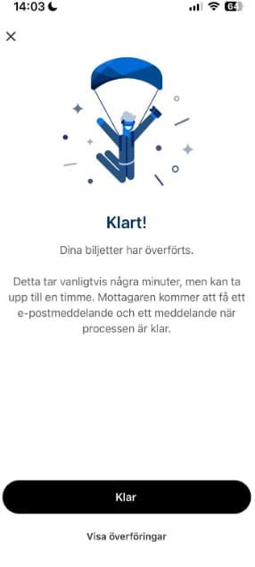 Du får även ett mail skickat till din e-post som bekräftar att biljetten har överförts och till vem.