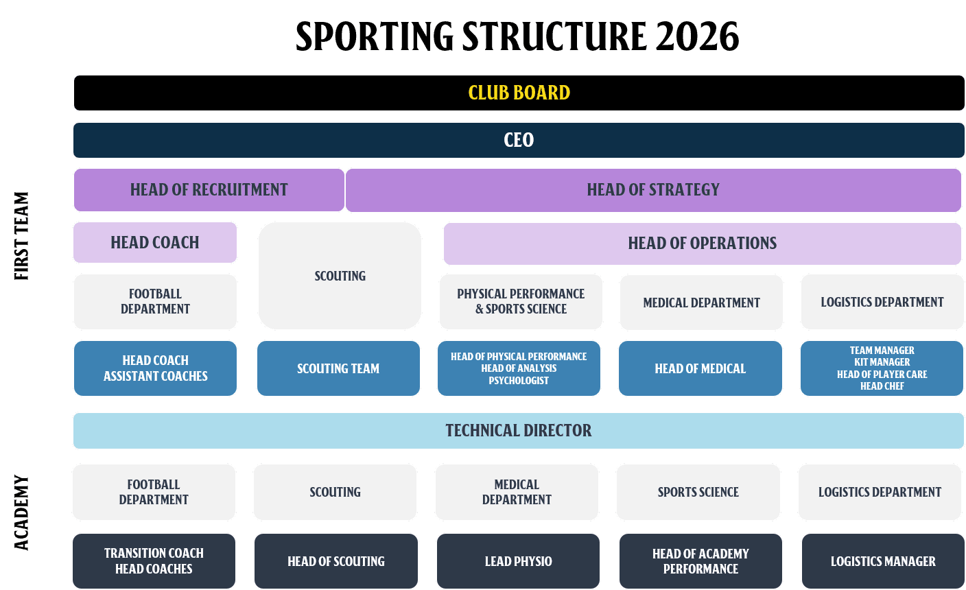 Strategichef (Jeremy Steele) – ansvarar för att säkerställa att klubbens sportsliga strategi, prestationsstandarder och arbetssätt implementeras konsekvent i samtliga sportsliga avdelningar.