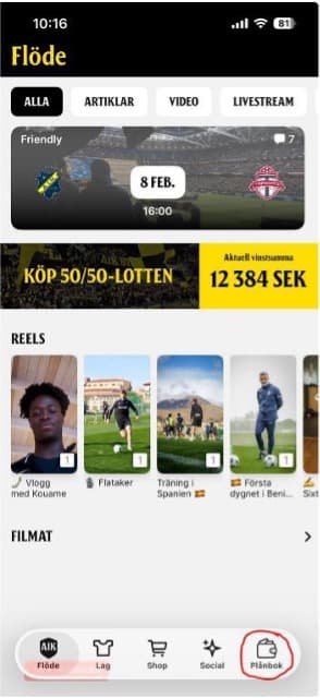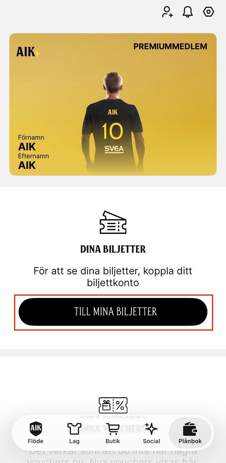Det första steget för att se dina biljetter och årskort i AIK+ är att du har appen nedladdad – samt ett aktivt konto. Det krävs inte ett premiummedlemskap för att få ta del av biljettfunktionen, däremot får du massor av annat spännande innehåll som premiummedlem.
