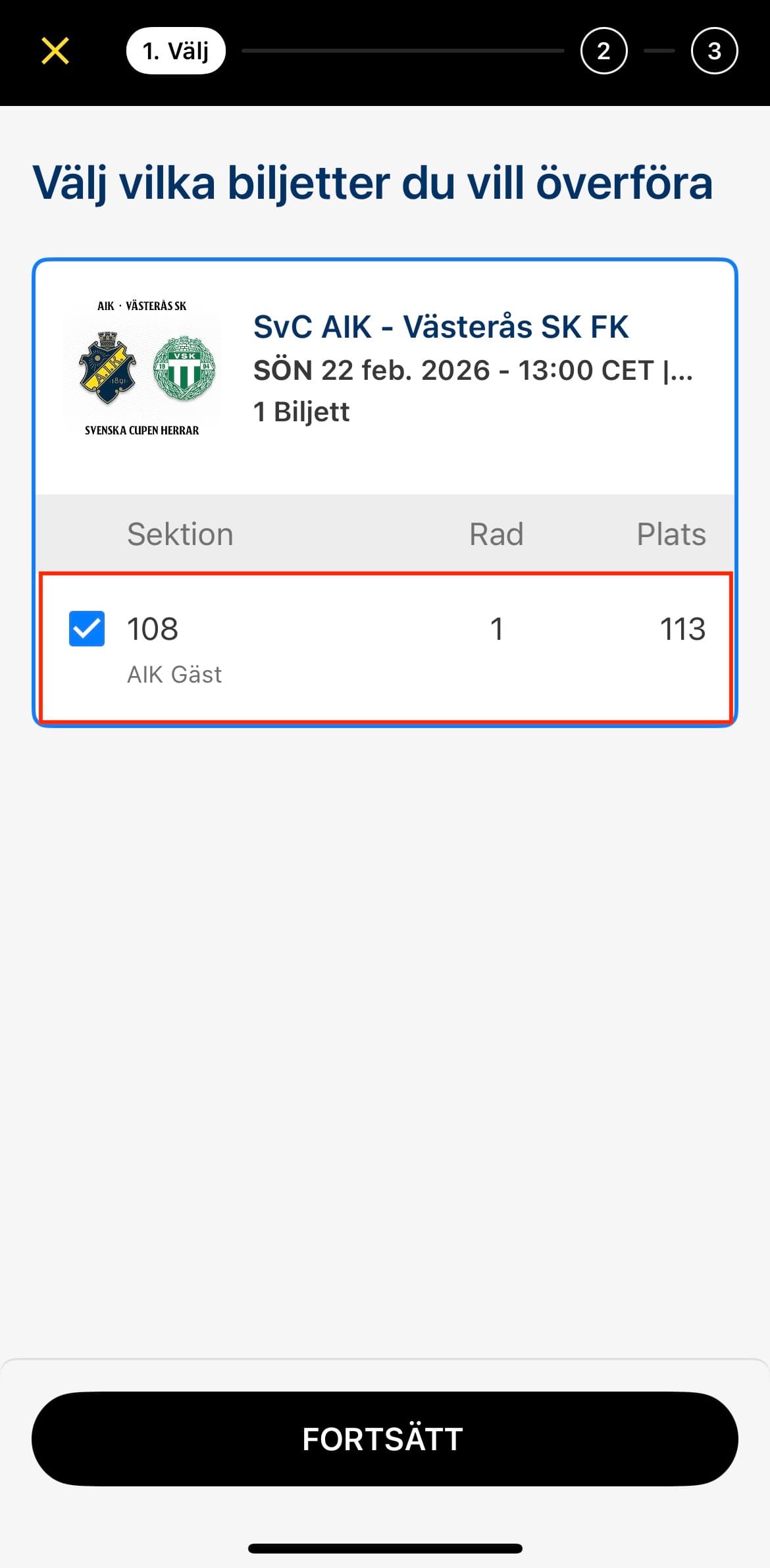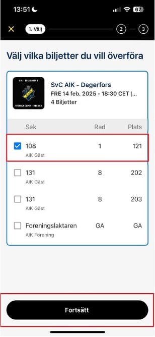 Klicka på "Fortsätt" när du bockat i biljetten eller biljetterna du ska dela vidare.