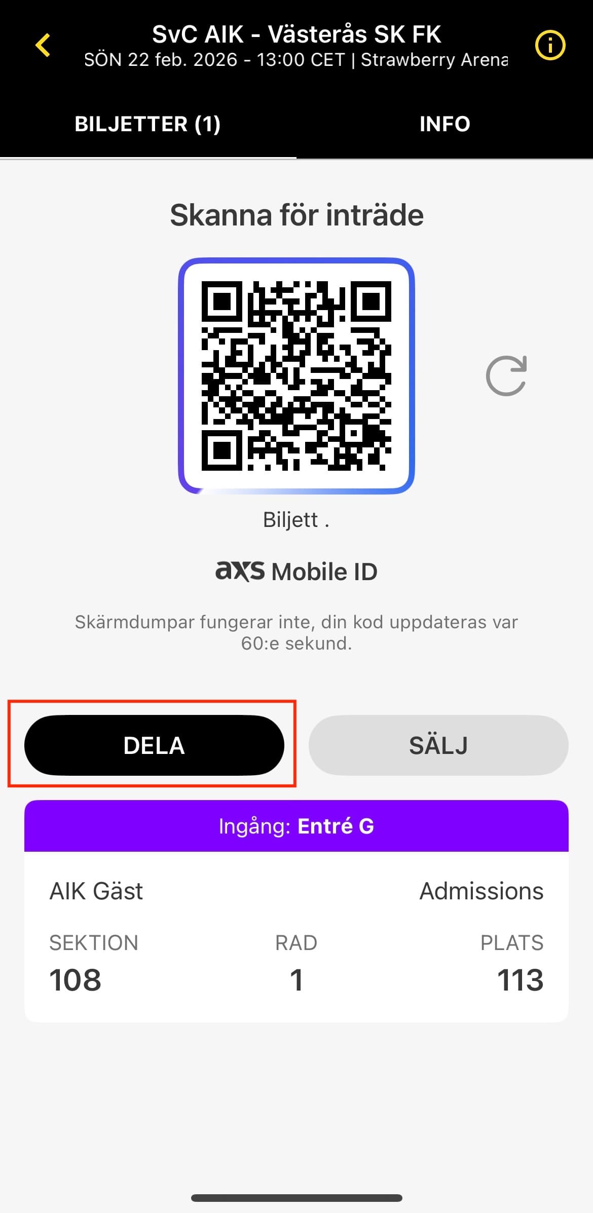 Klicka på "Visa" för att få fram QR-koden som gäller som entrébiljett för den aktuella matchen.