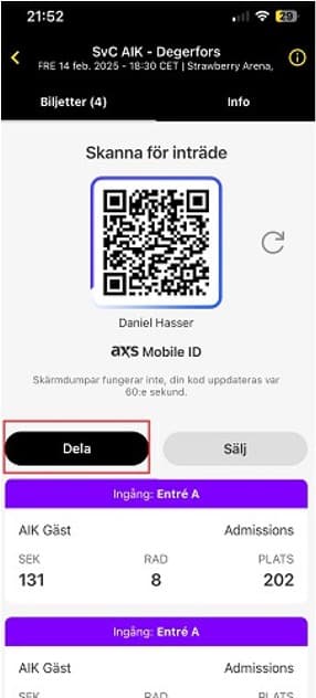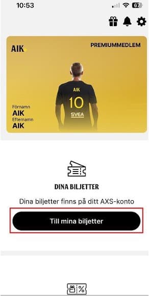 Den som mottagit biljetten finner sedan sin biljett i appen AIK+, alternativt AXS app.