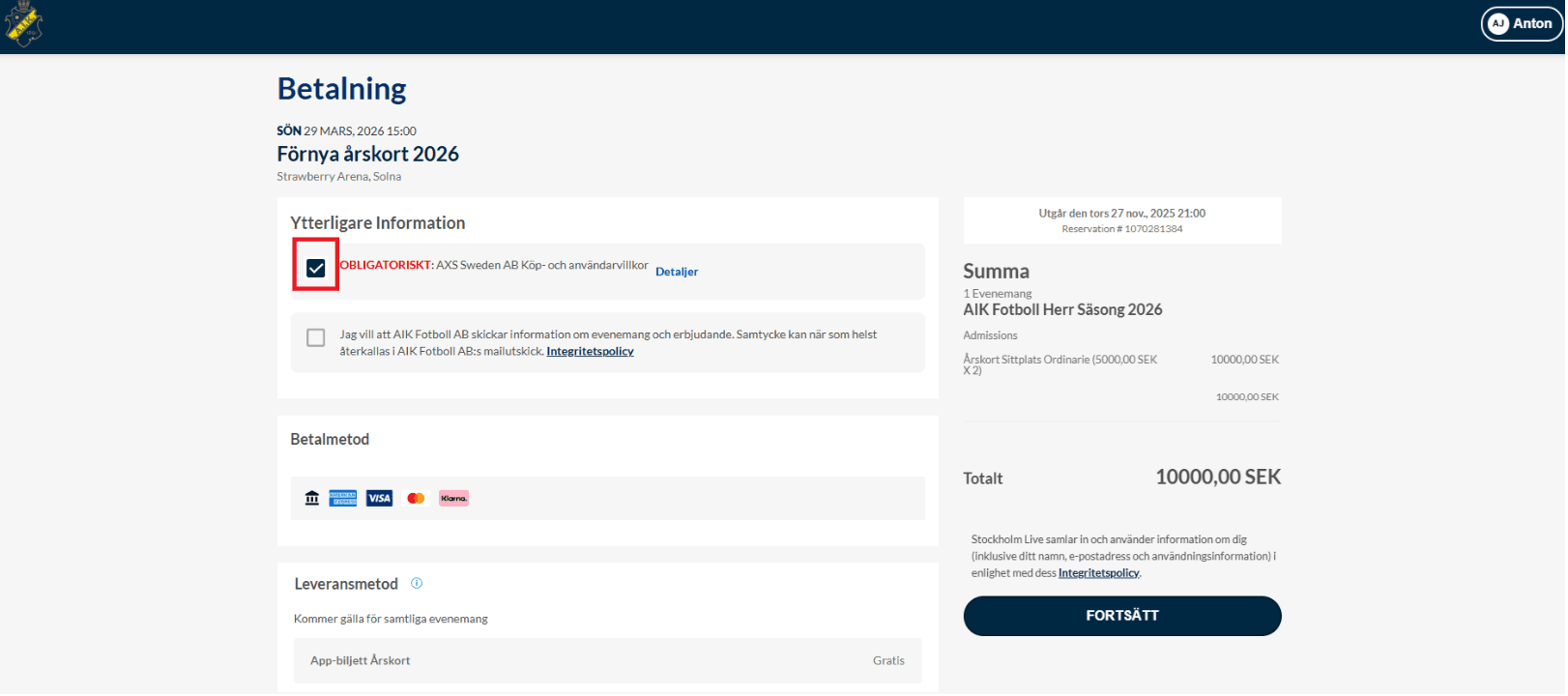 Avsluta sedan ditt köp genom att klicka på "Fortsätt" och välj sedan betalmetod.
