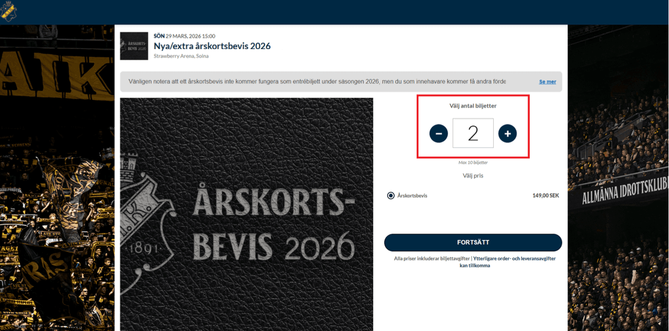 Du får nu välja antalet årskortsbevis dom du önskar köpa till. Var noggrann med att maxantalet årskortsbevis är samma antal som du har faktiska årskort.